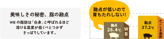 渡辺バークシャー牧場では、脂のことを「白身」と呼んでいます。純粋黒豚の脂の融点は、なんと28.4℃という低さ。手のひらにのせると体温で溶けてしまうほどです。純粋黒豚の白身は、驚くほどにあっさりで、コクのある甘みを楽しめます。 純粋黒豚の白身は格別です。白身の舌ざわりがなめらかで、口の中でスッと溶けていきます。あっさりとしているので、もたれずに食べ進められます。まろやかな甘みが余韻として残ります。